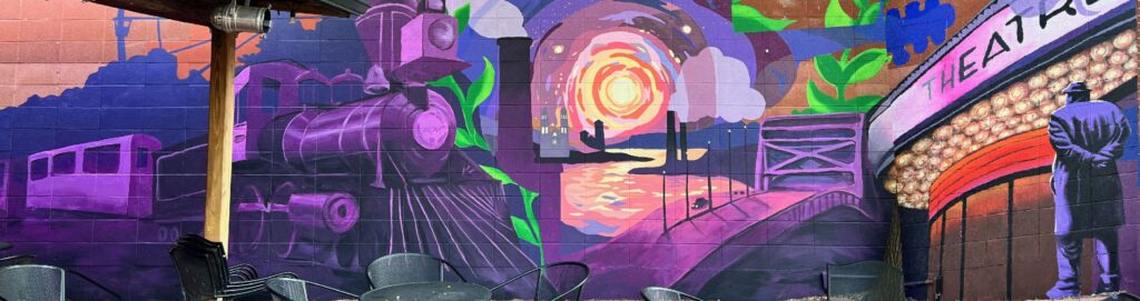 On the right, the mural pays homage to the arts with a depiction of the grand West/Tarlton theater marquee. A solitary figure in a coat and hat, none other than the legendary Packers coach Vince Lombardi, stands facing the theater, embodying the pride and excitement of the this community has become. His presence signifies pride in the community's growth and achievements. Bridging these diverse elements is a structure that symbolizes connection, continuity, and the shared journeys we all undertake in life.