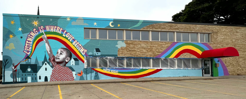 It was a beautiful day in the neighborhood as Manitowoc Sputnik Fest attendees came by to help paint the mural on First Presbyterian Church. Pastor Matt Sauer wanted a Mister Rogers-themed mural on his wall, since Mister Rogers was a Presbyterian minister and the "closest thing we have to a saint" he said. Pastor Matt has a giving and inclusive organization, so the mural was to display this idea to the traffic as they are heading down the hill into downtown Manitowoc.
