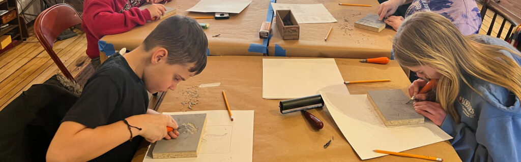 Students ages 10 and up spent a day in our printmaking studio learning the art of creating a linocut relief print. Participants began by learning what makes an ideal image for printing. Students then used gouges to form their linocut, roll on ink and pull their original work of art using hand-rubbing techniques and our etching press.